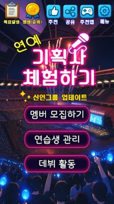 '기획사 체험하기 : 연예인 키우기, 이상형, K팝아이돌'에서 당신의 상상 속 K팝 아이돌 프로듀서가 되어보세요. 서울 곳곳에서 숨은 인재를 발굴하고, 다양한 미니게임으로 연습생을 훈련시켜 최고의 팀을 만드세요. 나만의 스타를 데뷔시키고 짜릿한 결과를 직접 경험할 수 있습니다.