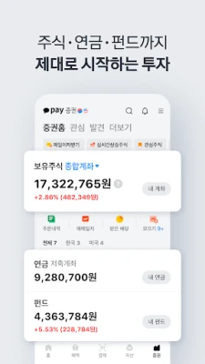 복잡한 금융을 한눈에 파악하고 관리하는 것은 카카오페이에서 일상이 됩니다. 송금, 결제, 카드, 계좌는 물론 보험, 대출, 투자까지, 흩어져 있던 자산을 한데 모아 번거로운 절차 없이 통합적으로 관리하세요. 주식 투자는 맞춤형 정보와 간편한 주문으로 시작하고, 세액공제 혜택의 연금저축이나 부담 없이 시작하는 펀드 동전 모으기로 자산을 불릴 수 있습니다. 가입한 모든 보험 내역 확인부터 복잡한 서류 없이 간편하게 병원비를 청구하고, 10개 보험사의 자동차 보험을 비교하여 나에게 꼭 맞는 설계를 찾아보세요. 오직 카카오페이에서만 만날 수 있는 특별한 보험 상품들도 당신을 기다립니다.