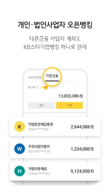 KB스타기업뱅킹은 기업 고객을 위한 스마트한 금융 파트너입니다. 타행 이체 수수료 면제, 간편한 자금 보고서, 전자세금계산서 발급은 물론, KB금융그룹의 다양한 서비스를 하나로 모아 편리하게 관리하세요. 24시간 언제 어디서나 기업 금융의 효율을 높여드립니다.