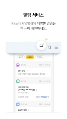 KB스타기업뱅킹은 단순한 뱅킹 앱을 넘어섭니다. 증권, 카드, 손해보험 등 KB금융그룹의 다양한 금융 서비스를 한곳에 모아 효율적으로 통합 관리할 수 있으며, 타 은행 계좌까지 한눈에 확인하는 오픈뱅킹으로 귀사의 전체 자산 현황을 더욱 넓은 시야로 조망할 수 있습니다. 여기에 평생 무료로 부동산 임대 관리를 돕는 KB임대관리비서 서비스까지 제공하여, 기업의 모든 재정 활동을 아우르는 전천후 솔루션을 완성합니다. 입출금 내역부터 필수 금융 정보까지, 맞춤형 알림으로 중요한 소식을 놓치지 마세요.