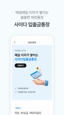 복잡한 금융에 시원한 한 모금 같은 경험을 선사하는 사이다뱅크로 새로운 모바일 금융 여정을 시작해보세요. 언제 어디서든 스마트폰 하나로 자유롭고 편리하게 자산을 관리하고, 잠자고 있는 돈까지 깨워 더 큰 가치를 창출할 기회를 드립니다. 일상의 금융을 더욱 쉽고, 현명하게 만들어줄 사이다뱅크의 특별한 혜택들을 만나보세요.